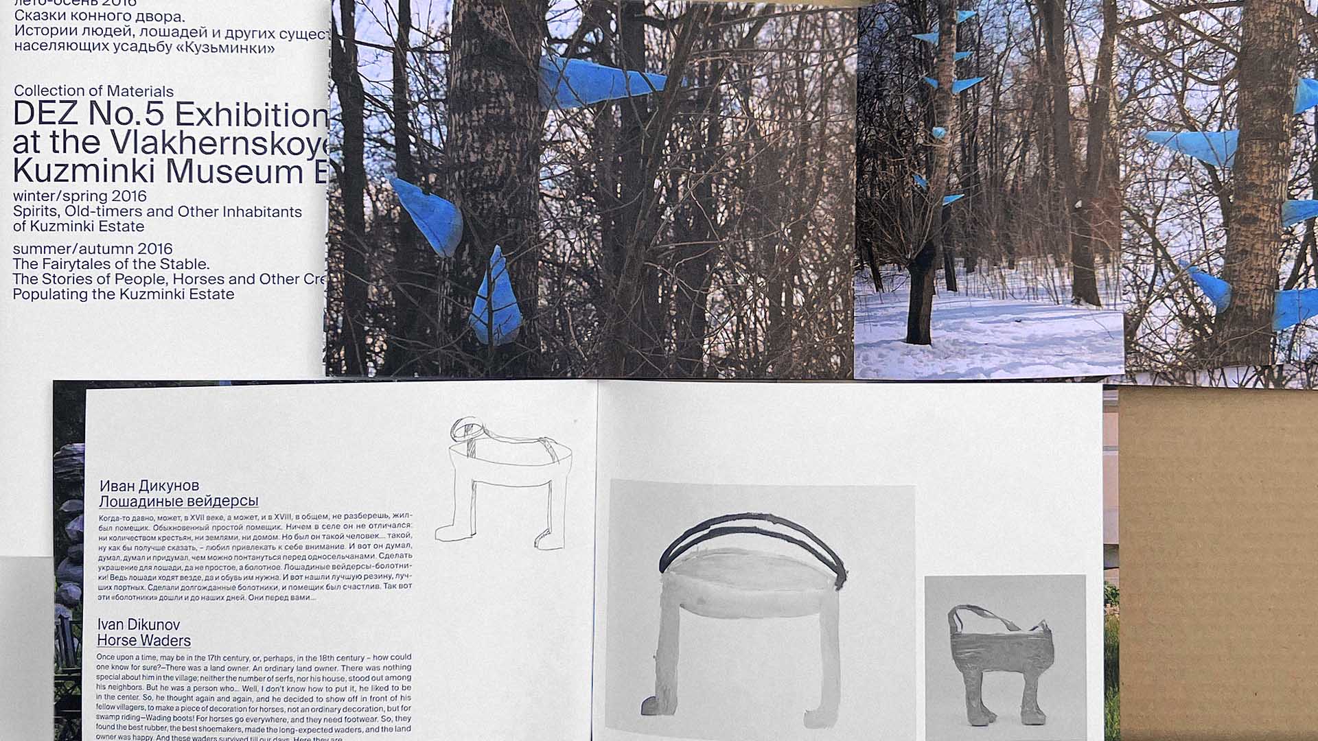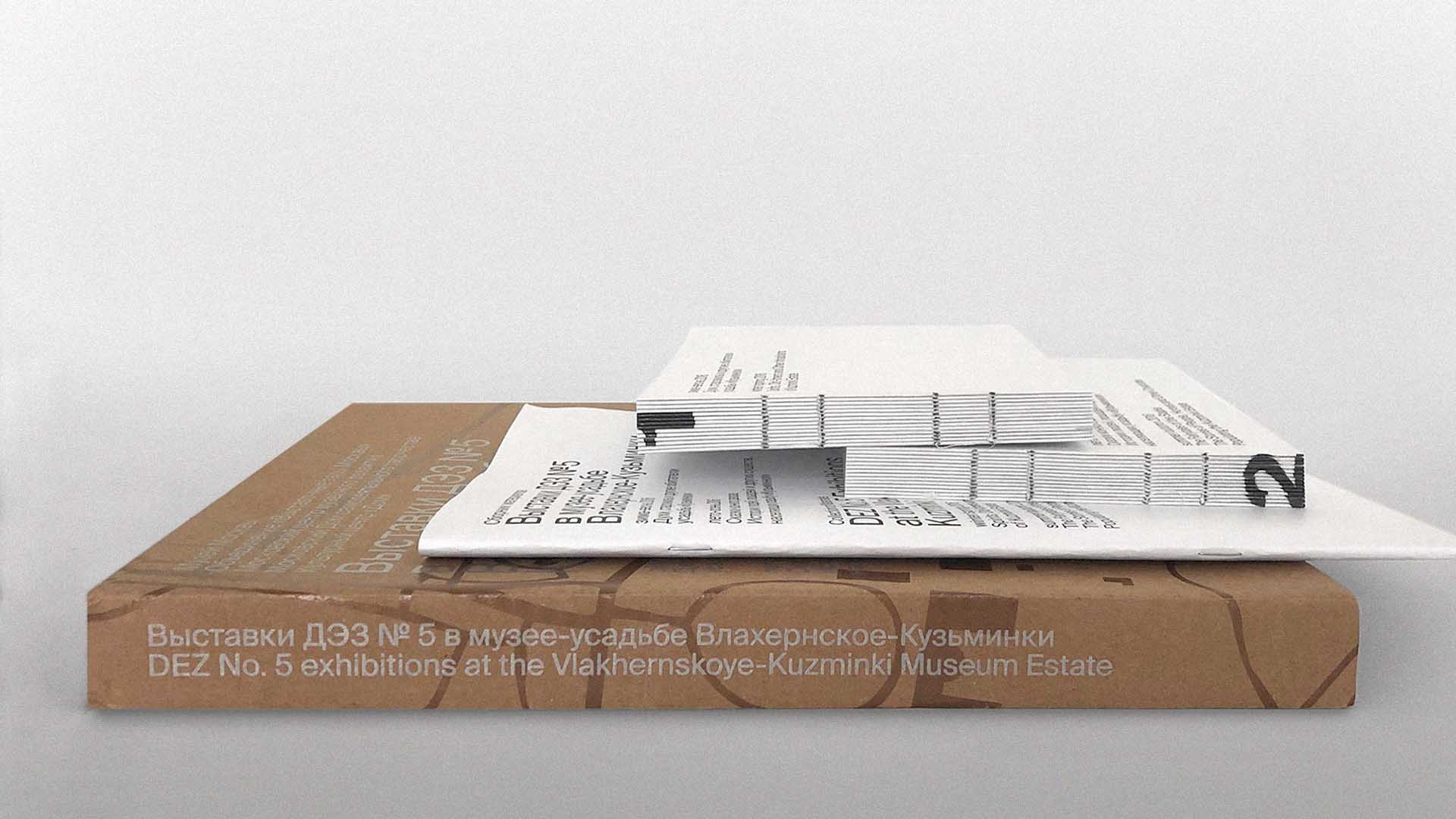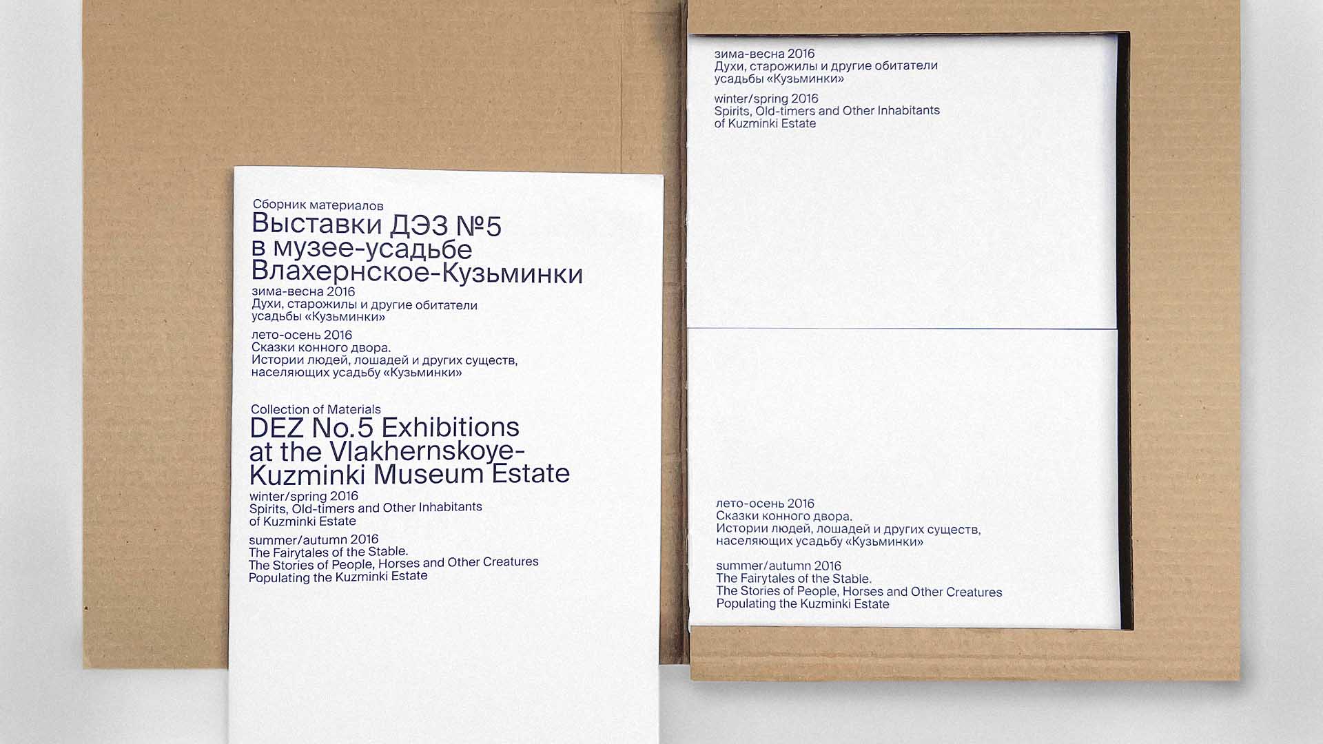 The publication showcases the results of a year-long exhibition project by children's studio DEZ No. 5. It consists of a unifying cardboard box, a collection of materials documenting the project's journey, and two catalogues for the winter and summer shows at the Vlakhernskoye-Kuzminki Estate of Princes Golitsyns.
