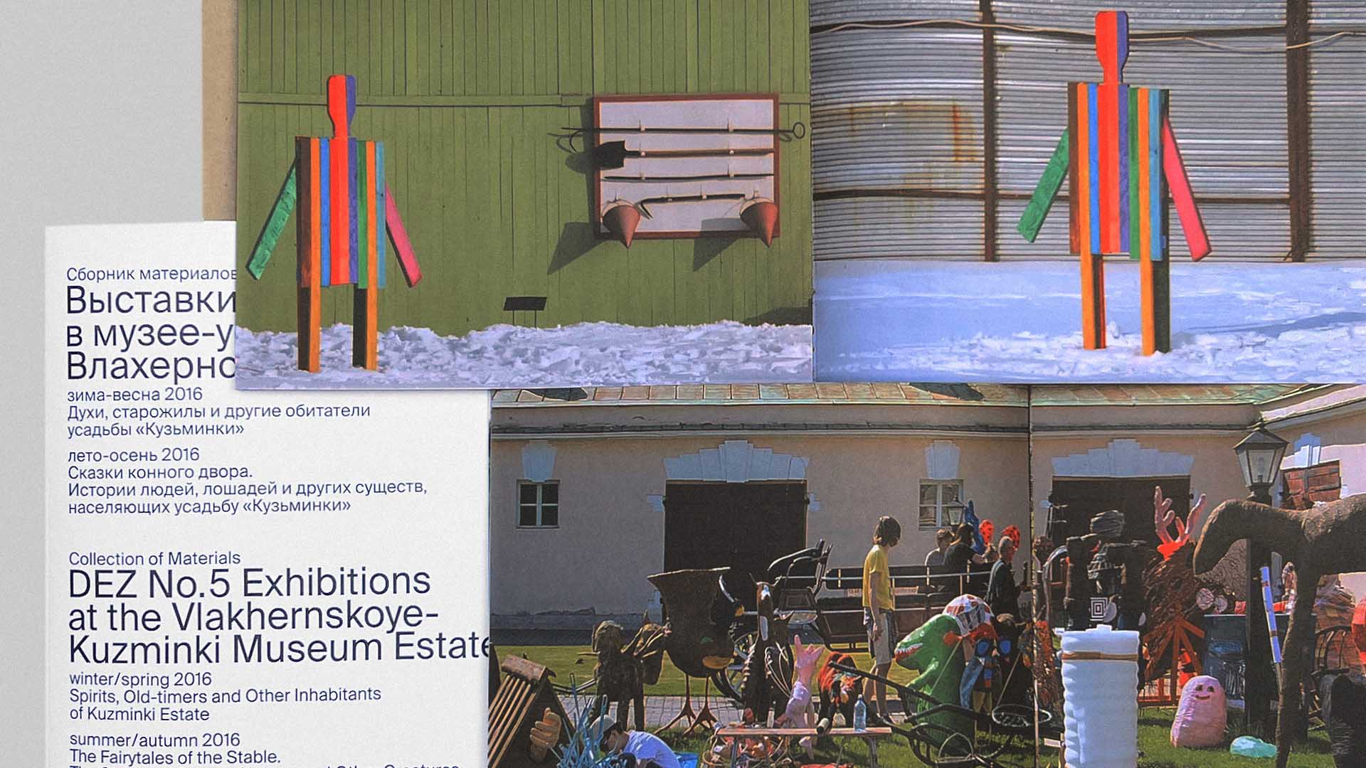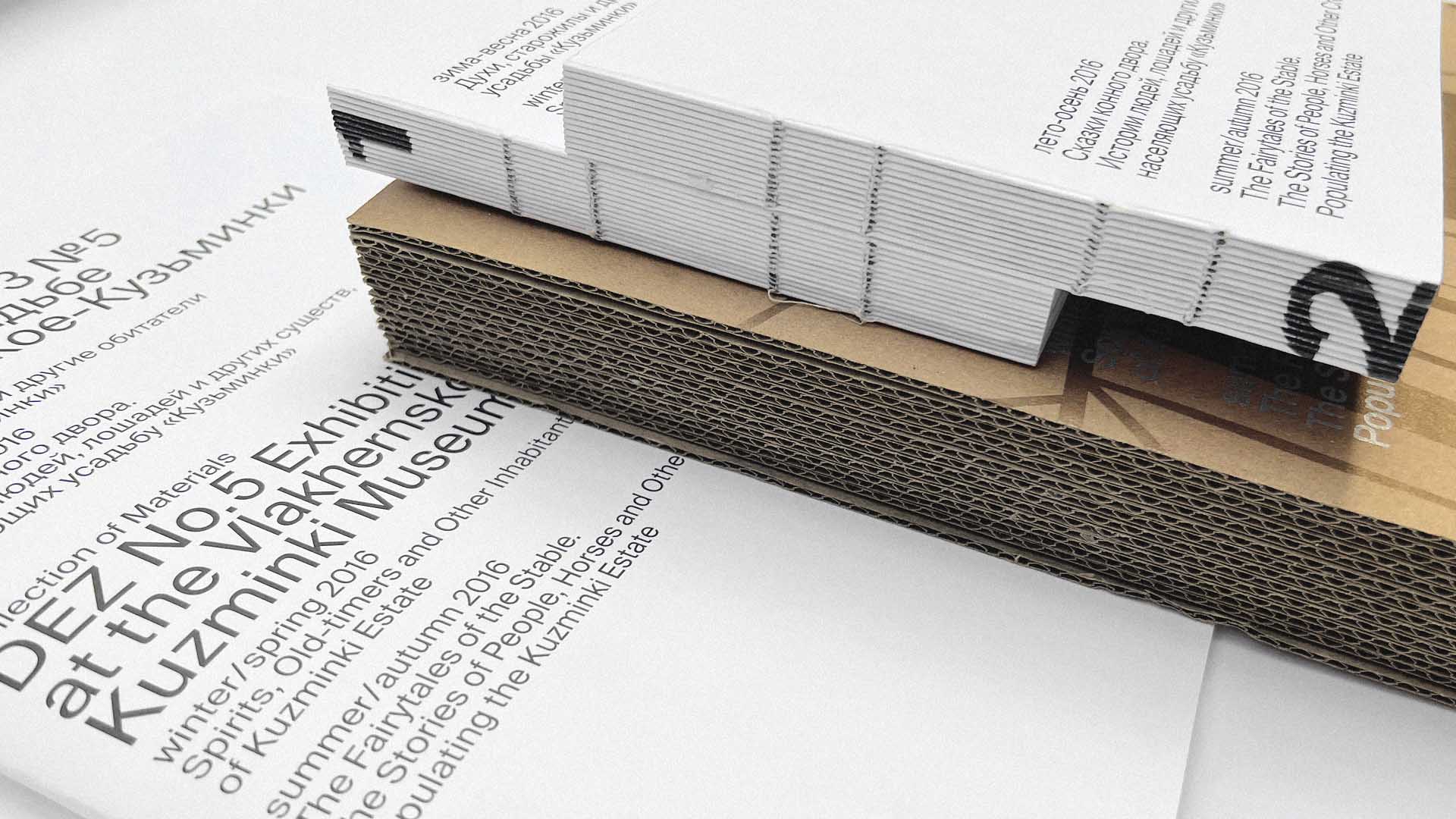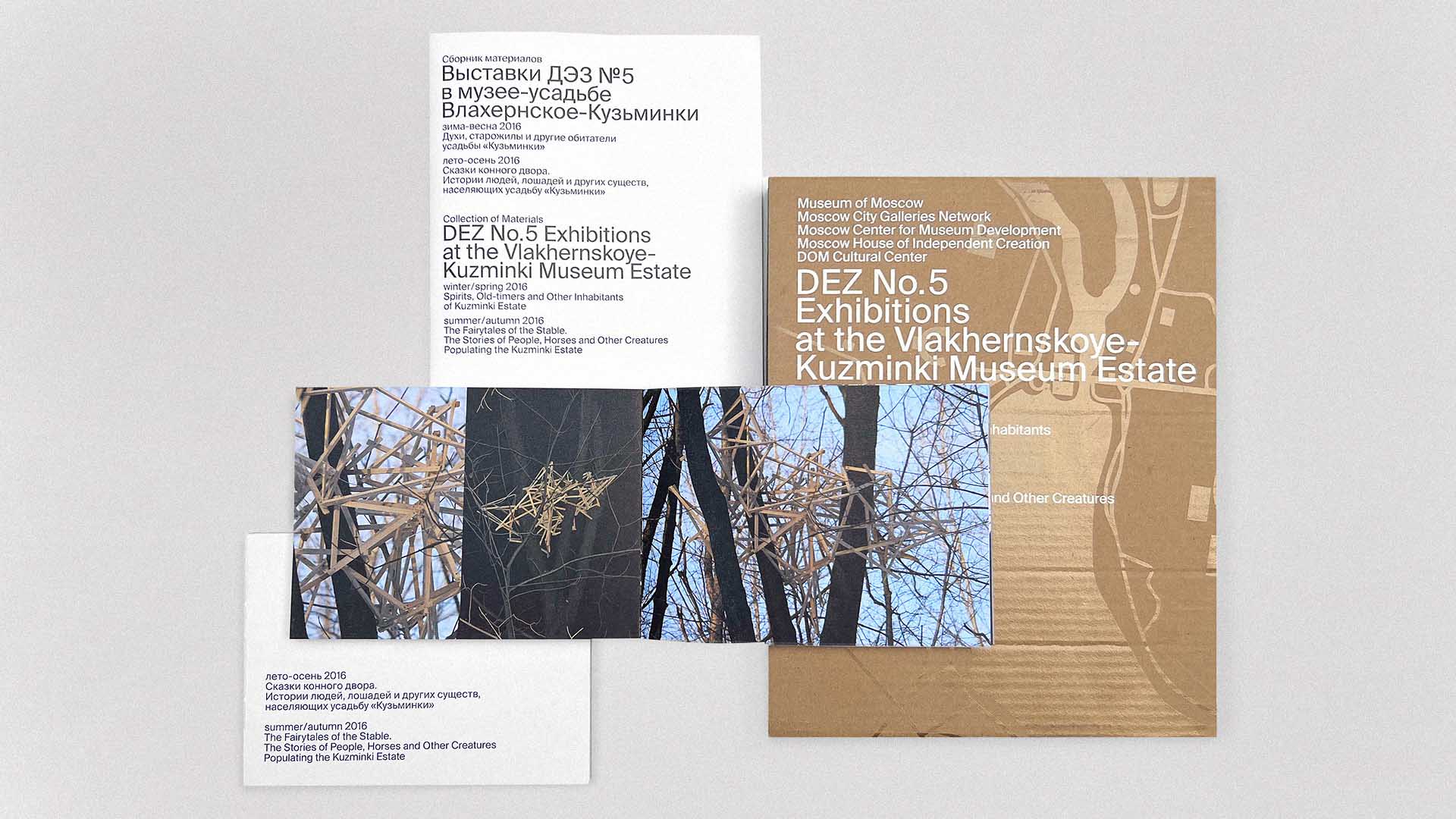 The publication showcases the results of a year-long exhibition project by children's studio DEZ No. 5. It consists of a unifying cardboard box, a collection of materials documenting the project's journey, and two catalogues for the winter and summer shows at the Vlakhernskoye-Kuzminki Estate of Princes Golitsyns.